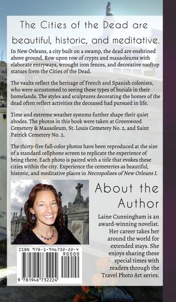 In New Orleans, a city built on a swamp, the dead are enshrined above ground. Row upon row of crypts and mausoleums with elaborate entryways, wrought iron fences, and decorative rooftop statues form the Cities of the Dead. The vaults reflect the heritage of French and Spanish colonists, who were accustomed to seeing these types of burials in their homelands. The styles and sculptures decorating the homes of the dead often reflect activities the deceased had pursued in life. Time and extreme weather systems further shape their quiet abodes. Beyond these places of final rest, New Orleans and nearby Jefferson Parish and East Baton Rouge Parish are striking places for tourism. On offer are unique French and Spanish Creole architecture, a mild climate, and a cross-cultural and multilingual heritage. Visitors flock to Mardi Gras, feel the hint of voodoo in the air, relax on the lawn of the Cabildo, and refresh themselves with a walk through the Garden District. Swamp boat rides, afternoons on a steamboat, and bayou tours are found only in and around New Orleans. Travelers who explore at any time of the year discover adventures and excitement steeped in culture and history. Now visitors to the American South can expand their knowledge base with an artist's view of the city of New Orleans and its Cities of the Dead. The photos in this book were taken at Greenwood Cemetery & Mausoleum, St. Louis Cemetery No. 2, and Saint Patrick Cemetery No. 2. The thirty-five color photos are paired with titles that evoke these cities within the city. Experience the cemeteries as beautiful, historic, and meditative places in Necropolises of New Orleans I. In the Travel Photo Art series, traditional tourism panoramas mix with arthouse aesthetics. These slim, intense productions are your passport to new perspectives on famous places. Peer around corners and discover a unique way to interact with monuments and memorials you thought you knew. This popular series includes titles that mix text with the pictures. Books like Notre Dame Cathedral: Our Lady of Paris, featuring photos taken months before the 2019 fire, become keepsakes associated with a specific site. Titles like Lidice Lives and Terezin and Theresienstadt are deeply meaningful for families touched by the Holocaust. Laine Cunningham, a three-time recipient of The Hackney Award, writes fiction that takes readers around the world. Her debut novel, The Family Made of Dust, is set in the Australian Outback, while Reparation is a novel of the American Great Plains. She is the editor of Sunspot Literary Journal.