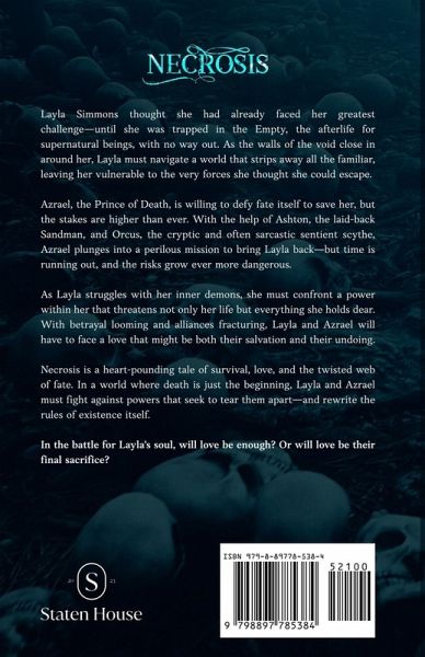 Layla Simmons thought she had already faced her greatest challenge-until she was trapped in the Empty, the afterlife for supernatural beings, with no way out. As the walls of the void close in around her, Layla must navigate a world that strips away all the familiar, leaving her vulnerable to the very forces she thought she could escape. Azrael, the Prince of Death, is willing to defy fate itself to save her, but the stakes are higher than ever. With the help of Ashton, the laid-back Sandman, and Orcus, the cryptic and often sarcastic sentient scythe, Azrael plunges into a perilous mission to bring Layla back-but time is running out, and the risks grow ever more dangerous. As Layla struggles with her inner demons, she must confront a power within her that threatens not only her life but everything she holds dear. With betrayal looming and alliances fracturing, Layla and Azrael will have to face a love that might be both their salvation and their undoing. Necrosis is a heart-pounding tale of survival, love, and the twisted web of fate. In a world where death is just the beginning, Layla and Azrael must fight against powers that seek to tear them apart-and rewrite the rules of existence itself. In the battle for Layla's soul, will love be enough? Or will love be their final sacrifice?