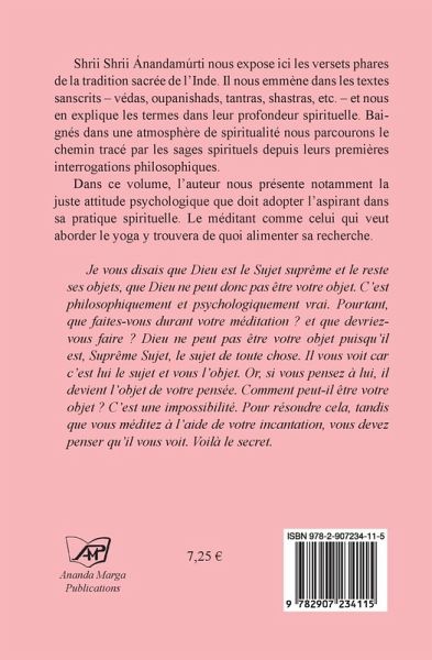 Shrii Shrii Anandamurti nous expose ici les versets phares de la tradition sacree de l Inde. Il nous emmène dans les textes sanscrits, vedas, upanishads, tantras, shastras, etc., nous explique leurs termes dans leur profondeur spirituelle. Baignes dans une atmosphère de spiritualite nous parcourons le chemin trace par les sages spirituels depuis leurs premieres interrogations philosophiques. Dans ce volume, l auteur nous presente notamment la juste attitude psychologique que doit adopter l’aspirant dans sa pratique spirituelle. Le meditant comme celui qui veut aborder le yoga y trouvera de quoi alimenter sa recherche. Je vous disais que Dieu est le Sujet supreme et le reste ses objets, que Dieu ne peut donc pas etre votre objet. C est philosophiquement et psychologiquement vrai. Pourtant, que faites-vous durant votre meditation? et que devriez-vous faire? Dieu ne peut pas etre votre objet puisqu il est, Supreme Sujet, le sujet de toute chose. Il vous voit car c’est lui le sujet et vous l objet. Or, si vous pensez à lui, il devient l objet de votre pensee. Comment peut-il etre votre objet? C est une impossibilite. Pour resoudre cela, tandis que vous meditez a l aide de votre incantation, vous devez penser qu il vous voit. Voila le secret.