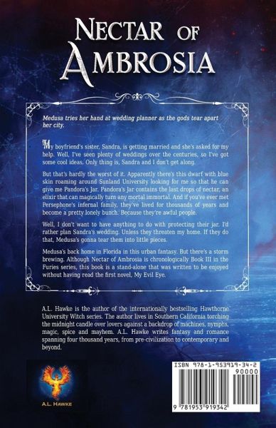 Medusa tries her hand at wedding planner as the gods tear apart her city. My boyfriend's sister, Sandra, is getting married and she's asked for my help. Well, I've seen plenty of weddings over the centuries, so I've got some cool ideas. Only thing is, Sandra and I don't get along. But that's hardly the worst of it. Apparently there's this dwarf with blue skin roaming around Sunland University looking for me so that he can give me Pandora's Jar. Pandora's Jar contains the last drops of nectar, an elixir that can magically turn any mortal immortal. And if you've ever met Persephone's infernal family, they've lived for thousands of years and become a pretty lonely bunch. Because they're awful people. Well, I don't want to have anything to do with protecting their jar. I'd rather plan Sandra's wedding. Unless they threaten my home. If they do that, Medusa's gonna tear them into little pieces. Medusa's back home in Florida in this urban fantasy. But there's a storm brewing. Although Nectar of Ambrosia is chronologically Book III in the Furies series, this book is a stand-alone that was written to be enjoyed without having read the first novel, My Evil Eye.