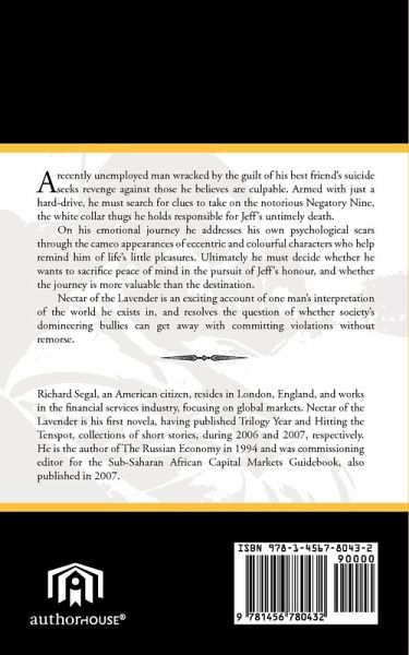 A recently unemployed man wracked by the guilt of his best friend's suicide seeks revenge against those he believes are culpable. Armed with just a hard-drive, he must search for clues to take on the notorious Negatory Nine, the white collar thugs he holds responsible for Jeff's untimely death. On his emotional journey he addresses his own psychological scars through the cameo appearances of eccentric and colourful characters who help remind him of life's little pleasures. Ultimately he must decide whether he wants to sacrifice peace of mind in the pursuit of Jeff's honour, and whether the journey is more valuable than the destination. Nectar of the Lavender is an exciting account of one man's interpretation of the world he exists in, and resolves the question of whether society's domineering bullies can get away with committing violations without remorse.