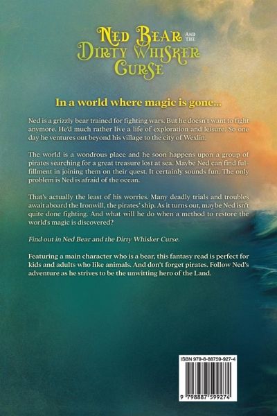In a world where magic is gone... Ned is a grizzly bear trained for fighting wars. But he doesn't want to fight anymore. He'd much rather live a life of exploration and leisure. So one day he ventures out beyond his village to the city of Wexlin. The world is a wondrous place and he soon happens upon a group of pirates searching for a great treasure lost at sea. Maybe Ned can find fulfillment in joining them on their quest. It certainly sounds fun. The only problem is Ned is afraid of the ocean. That's actually the least of his worries. Many deadly trials and troubles await aboard the Ironwill, the pirates' ship. As it turns out, maybe Ned isn't quite done fighting. And what will he do when a method to restore the world's magic is discovered? Find out in Ned Bear and the Dirty Whisker Curse. Featuring a main character who is a bear, this fantasy read is perfect for kids and adults who like animals. And don't forget pirates. Follow Ned's adventure as he strives to be the unwitting hero of the Land.
