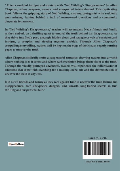 " Enter a world of intrigue and mystery with "Ned Wilding's Disappearance" by Allen Chapman, where suspense, secrets, and unexpected twists abound. This captivating book follows the gripping story of Ned Wilding, a young protagonist who suddenly goes missing, leaving behind a trail of unanswered questions and a community desperate for answers. In "Ned Wilding's Disappearance," readers will accompany Ned's friends and family as they embark on a thrilling quest to unravel the truth behind his disappearance. As they delve into Ned's past, untangle hidden clues, and navigate a web of suspicion and intrigue, a complex and riveting mystery unfolds. Through Allen Chapman's compelling storytelling, readers will be kept on the edge of their seats, eagerly turning pages to uncover the truth. Allen Chapman skillfully crafts a suspenseful narrative, drawing readers into a world where nothing is as it seems and where each revelation brings them closer to the truth. Through the vividly portrayed characters, readers will experience the rollercoaster of emotions that come with searching for a missing loved one and the determination to uncover the truth at any cost. Join Ned's friends and family as they race against time to uncover the truth behind his disappearance, face unexpected dangers, and unearth long-buried secrets in this thrilling and suspenseful tale."