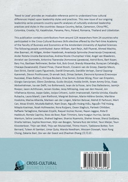 'Need to Lead' provides an invaluable reference point for senior executives or those striving towards a successful cross-border career, to understand how cultural differences impact upon leadership styles and practices. Each semester, we publish a report on our quantitative survey-based global study, alongside our review of extant in-country leadership literature, preferably written by local scholars and professionals in their native language. Moreover, we attempt to empirically validate these findings by conducting expert interviews with native specialists. This new issue of our ongoing leadership series presents country-specific analyses of culturally endorsed leadership practices and styles in the following countries or regions: Basque country, Belize, Cameroon, China PRC, Colombia, Croatia, Fiji, Kazakhstan, Panamá, Perú, Poland, Romania, Thailand and Uzbekistan. This publication contains contributions from around 124 researchers from 24 countries who participated in the Cross-Cultural Business Skills elective offered by the Part-time Academy of the Faculty of Business and Economics at the Amsterdam University of Applied Sciences (HvA).