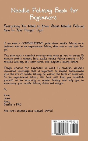 Are you looking for amazing DIY crafts you can start right now to explore your creative side? Do you want a step by step guide to creating awesome needle felting projects in no time? Do you want to monetize your needle felting skills and felted projects? If so, then keep reading! Needle Felting Book for Beginners shows you everything you need to know to begin your needle felting journey in creating amazing needle felted designs. This book though written for beginners, its content, however, is adapted to suit everyone (kids and adults alike) irrespective of their level of proficiency in needle felting. As a beginner, you will learn how to commence your needle felting journey and make amazing crafts. You will be taken by the hand and walked through a step-by-step clearly illustrated and pictorial guide of 15 needle-felting projects such as: Felted buttons Felted rainbow pillow Felted teacup Felted dog Felted cat Felted dala horse Felted rabbit Felted elephant and; Felted teddy bear among others As an experienced felter, you will learn how to take your craft to the next level, how to establish yourself as an authority in the art of needle felting while building a community around it, and how you can earn massively from your crafts. In summary, this book will; Provide you with in-depth knowledge of what needle felting entails Expose you to the therapeutic benefits of needle felting, including its role in reducing the possibility of having Alzheimer's disease Educate you on the key needle felting terminologies you need to know Help you uncover the important tools and materials you need to get started with your craft Enlighten you on how to monetize your craft, become an authority in it and build a community around it. Show you some important tips and tricks to make the most of your needle felting journey worthwhile Help you address important questions and problems other felters usually encounter ...And so much more! This book has helped demystify the art of needle felting in a simplistic manner that makes it even possible for a child to comprehend. So then, even if you are a "total novice," you have nothing to be worried about because this book can turn you into a skilled needle felter in no time, with enough practice and patience. If you are ready to kickstart your needle felting journey and give life to that awesome idea, then get this book RIGHT NOW!