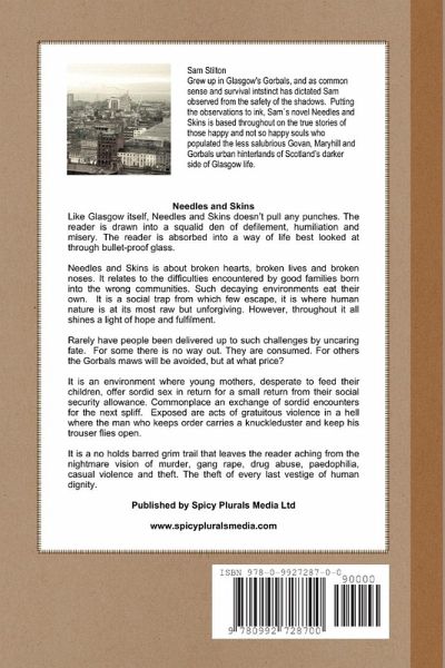 Needles and Skins a novel by Sam Stilton, is set predominantly in the Gorbals of Glasgow, Scotland, it is based throughout on the true stories of those happy and not so happy souls who populated the less salubrious Govan, Maryhill and Gorbals - the urban hinterlands of Scotland's darker side. Like Glasgow itself, Needles and Skins doesn't pull any punches. The reader is drawn into a squalid den of defilement, humiliation and misery. The reader is absorbed into a way of life best looked at through bullet-proof glass. It relates to the difficulties encountered by good families born into the wrong communities. It is a social trap from which few escape, it is where human nature is at its most raw but unforgiving. However, throughout it all shines a light of hope and fulfilment. It is a no holds barred grim trail that leaves the reader aching from the nightmare vision of murder, gang rape, drug abuse, paedophilia, casual violence and theft. The theft of every last vestige of human dignity.