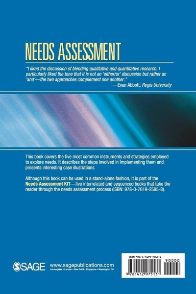 This book covers the five most common instruments and strategies employed to explore needs. It describes the steps involved in implementing them and presents interesting case illustrations. Although this book can be used in a stand-alone fashion, it is part of the Needs Assessment KIT - five interrelated and sequenced books that take the reader through the needs assessment process (ISBN: 978-0-7619-2595-8).