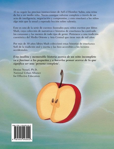 Deseando desesperadamente tener un hijo varón, la reina de Hich-Hich consulta a Arif el Sabio sobre el asunto. Pero debido a que no sigue las instrucciones precisas de Arif, da a luz a un medio niño, a quien llama Neem. El hecho de que Neem sea capaz de completarse mediante un acto de inteligencia, negociación y compromiso les enseña a los niños mucho más que la lección de valentía habitual y esperada. Este cuento encantador, completo con hadas y un dragón que escupe fuego, está maravillosamente ilustrado por Midori Mori y Robert Revels. Neem el medio niño forma parte de una serie ilustrada de historias de enseñanza sufíes de Oriente Medio y Asia central que Idries Shah recopiló y adaptó para niños y que han cautivado corazones y mentes durante más de mil años. Las historias están diseñadas para ayudar a los niños a aprender a examinar sus suposiciones y a pensar por sí mismos.