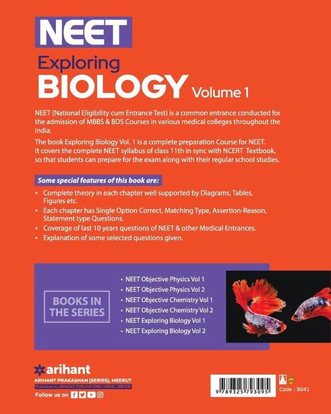 1. Best-selling study guide and well-structured study resource for NEET, AIIMS, JIPMER. 2. NEET Objective Biology Vol 1. - for class 11 3. The book follows the NCERT pattern for MBBS & BDS entrance preparation along with their school studies. 4. Diagrams, tables, figures etc support theory 5. Practice exercises after every chapter 6. Coverage of last 8 Years Questions of NEET, CBSEE AIPMT and Other Medical Entrances. The "NEET Exploring Biology Volume - 01" is a complete comprehensive book designed for the medical students preparing for NEET. As the title suggests the volume -1 covers the complete NEET syllabus along with NCERT Textbook of class 11th into 29 Chapters for the simultaneous preparation of both school & exam. Every chapter is well supported by theories, diagrams, tables, figures. Important points and Notes are given in the topics to enrich students. In order to help, Check Point Exercises are given in between the text of all chapters to make students linked with the topic. Solved Examples are given with the different concepts of chapters to make students learn the problem solving skills. Exercises provided in the chapters are divided into 3 parts. Part - A: Topical Exercise - consists of NEET Level MCQs arranged in a Chapterwise manner. Part - B: Cumulative Exercise - contains Advanced Level Objective Questions arranged in Assertion and Reason manner to give conceptual Clarity, Part - C: Medical Entrances' Gallery - asked questions in Last 10 years' (2020-2011) in NEET and other medical entrances. TOC The Living World, Biological Classification, Viruses, Monera, Protista, Fungi, Plantae, Animalia - I, Animalia -II, Animalia - III, Morphology of Flowering Plants, Anatomy of Flowering Plants, Animal Tissues, Structural Organisation in Some Animals, Cell: The Unit of Life, Cell Cycle of Cell Division, Biomolecules and Enzymes, Transport in Plants, Mineral Nutrition, Photosynthesis in Higher Plants, Respiration in Plants, Plants Growth and Development, Digestion and Absorption, Breathing and Exchange of Gases, Body Fluid and Circulation, Excretory Products and Their Elimination, Movement and Locomotion, Neural Control and Coordination, Chemical Coordination and Integration, Appendix, Multi-Colored Pages.