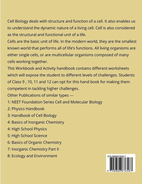 Cell Biology deals with structure and function of a cell. It also enables us to understand the dynamic nature of a living cell. Cell is also considered as the structural and functional unit of a life. Cells are the basic unit of life. In the modern world, they are the smallest known world that performs all of life's functions. All living organisms are either single cells, or are multicellular organisms composed of many cells working together. This Workbook and Activity handbook contains different worksheets which will expose the student to different levels of challenges. Students of Class 9, 10, 11 and 12 can opt for this hand book for making them competent in tackling higher challenges. Other Publications of similar types --- 1: NEET Foundation Series Cell and Molecular Biology 2: Physics Handbook 3: Handbook of Cell Biology 4: Basics of Inorganic Chemistry 4: High School Physics 5: High School Science 6: Basics of Organic Chemistry 7: Inorganic Chemistry Part II 8: Ecology and Environment