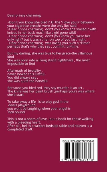 Dear prince charming , Don't you know she bled ? All the 'i love you's' between your cigarette breaths were the only lies said. Dear prince charming , don't you know she smiled ? with knives in her back much like a girl gone wild? Dear prince charming , don't you know you were her only light? but it wasn't her on top of you last night. Dear prince charming , was loving you such a crime? perhaps that's why they say , commit full-time. But , my darling she was true to her grace-the villianous kind. She was born in a living starlit nightmare,the most impossible to find Aftermath of brutality , never looked this lustful. You did always say , she was quiet the handful. Because you bled red , they say murder is an art , The knife was her paint brush , perhaps yours was where she'd start. To take away a life , is to play god in the devil's playground you wont be laughing when your angel is hell bound. It's not a love poem , but a book for those walking with a bleeding heart. After all , hell is a writers bedside table and heaven is a completed draft.