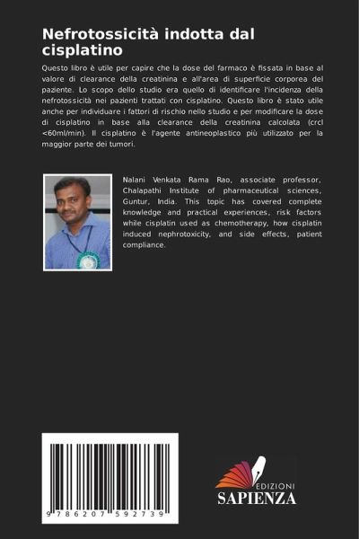 Questo libro è utile per capire che la dose del farmaco è fissata in base al valore di clearance della creatinina e all'area di superficie corporea del paziente. Lo scopo dello studio era quello di identificare l'incidenza della nefrotossicità nei pazienti trattati con cisplatino. Questo libro è stato utile anche per individuare i fattori di rischio nello studio e per modificare la dose di cisplatino in base alla clearance della creatinina calcolata (crcl <60ml/min). Il cisplatino è l'agente antineoplastico più utilizzato per la maggior parte dei tumori.