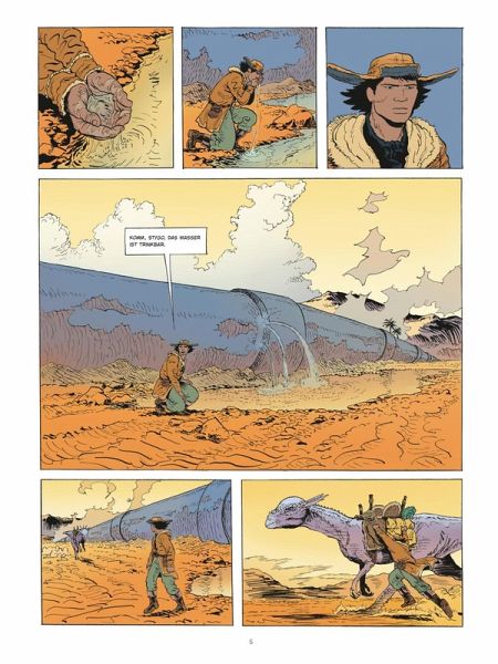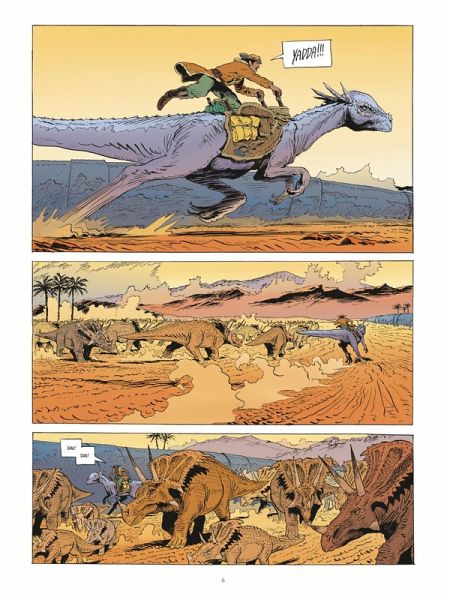 Vincent Perriot vereint im Stil Moebius' prähistorische Kreaturen, Science-Fiction-Urbanismus sowie Low-Tech-Schiffe. Dieser futuristische, dystopische Western präsentiert in großartig kolorierten Panels mit prächtigen Dekoren eine Geschichte über Widerstand aber auch über die Entdeckung des Selbst und des Anderen.