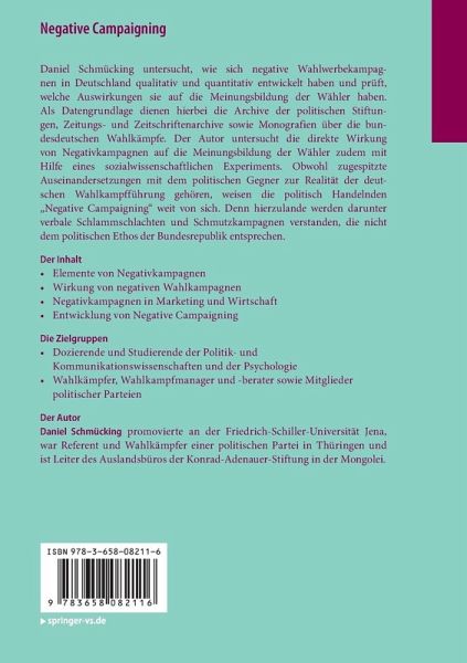 Daniel Schmücking untersucht, wie sich negative Wahlwerbekampagnen in Deutschland qualitativ und quantitativ entwickelt haben und prüft, welche Auswirkungen sie auf die Meinungsbildung der Wähler haben. Als Datengrundlage dienen hierbei die Archive der politischen Stiftungen, Zeitungs- und Zeitschriftenarchive sowie Monografien über die bundesdeutschen Wahlkämpfe. Der Autor untersucht die direkte Wirkung von Negativkampagnen auf die Meinungsbildung der Wähler zudem mit Hilfe eines sozialwissenschaftlichen Experiments. Obwohl zugespitzte Auseinandersetzungen mit dem politischen Gegner zur Realität der deutschen Wahlkampfführung gehören, weisen die politisch Handelnden "Negative Campaigning" weit von sich. Denn hierzulande werden darunter verbale Schlammschlachten und Schmutzkampagnen verstanden, die nicht dem politischen Ethos der Bundesrepublik entsprechen.
