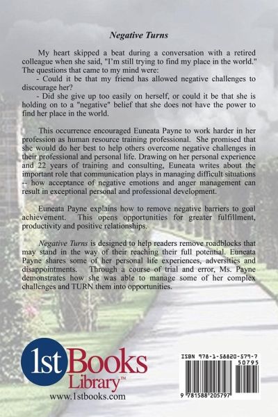 My heart skipped a beat during a conversation with a retired colleague when she said, "I'm still trying to find my place in the world." The questions that came to my mind were: Could it be that my friend has allowed negative challenges to discourage her? Did she give up too easily on herself, or could it be that she is holding on to a "negative" belief that she does not have the power to find her place in the world. This occurrence encouraged Euneata Payne to work harder in her profession as human resource training professional. She promised that she would do her best to help others overcome negative challenges in their professional and personal life. Drawing on her personal experience and 22 years of training and consulting, Euneata writes about the important role that communication plays in managing difficult situations -- how acceptance of negative emotions and anger management can result in exceptional personal and professional development. Euneata Payne explains how to remove negative barriers to goal achievement. This opens opportunities for greater fulfillment, productivity, and positive relationships. Negative Turns is designed to help readers remove roadblocks that may stand in the way of their reaching their full potential. Euneata Payne shares some of her personal life experiences, adversities, and disappointments. Through a course of trial and error, Ms. Payne demonstrates how she was able to manage some of her complex challenges and TURN them into opportunities. Negative Turns, a practical guide for turning your life around, can help anyone to remove negative roadblocks that may threaten their success. The book is compelling because it will inspire the reader to overcome negative challenges that come their way as they work to accomplish their personal and/or professional goals. This book will help the reader successfully identify negative challenges and develop a plan that will help them achieve their objectives. Negative Turns is a quick-read. Each chapter contains an action guide to help the reader develop a plan for turning negative challenges and attitudes into positive outcomes. § By sharing personal triumphs, disappointments, and simple life strategies, Euneata inspires you to manage negative challenges, and overcome adversity. After reading Negative Turns, you will literally be able to turn your life around by removing the roadblocks to your personal and professional success. § Negative Turns will inspire you to make lasting behavior changes in your personal and professional life. § Negative Turns will inspire you to take responsibilities for your own attitude and success. § By providing practical strategies and creative ideas, Euneata will coach you to lasting success.