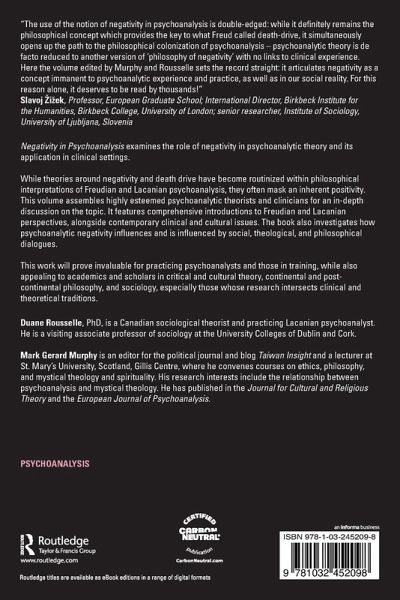 "The use of the notion of negativity in psychoanalysis is double-edged: while it definitely remains the philosophical concept which provides the key to what Freud called death-drive, it simultaneously opens up the path to the philosophical colonization of psychoanalysis - psychoanalytic theory is de facto reduced to another version of "philosophy of negativity" with no links to clinical experience. Here the volume edited by Murphy and Rousselle sets the record straight: it articulates negativity as a concept immanent to psychoanalytic experience and practice, as well as in our social reality. For this reason alone, it deserves to be read by thousands!" - Slavoj Zizek, Professor, European Graduate School; International Director, Birkbeck Institute for the Humanities, Birkbeck College, University of London; senior researcher, Institute of Sociology, University of Ljubljana, Slovenia