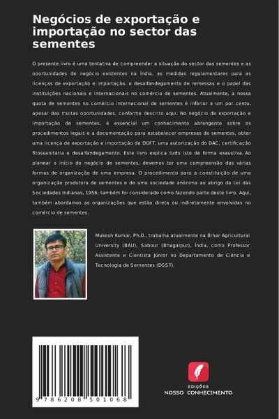 O presente livro é uma tentativa de compreender a situação do sector das sementes e as oportunidades de negócio existentes na Índia, as medidas regulamentares para as licenças de exportação e importação, o desalfandegamento de remessas e o papel das instituições nacionais e internacionais no comércio de sementes. Atualmente, a nossa quota de sementes no comércio internacional de sementes é inferior a um por cento, apesar das muitas oportunidades, conforme descrito aqui. No negócio de exportação e importação de sementes, é essencial um conhecimento abrangente sobre os procedimentos legais e a documentação para estabelecer empresas de sementes, obter uma licença de exportação e importação da DGFT, uma autorização do DAC, certificação fitossanitária e desalfandegamento. Este livro explica tudo isto de forma exaustiva. Ao planear o início do negócio de sementes, devemos ter uma compreensão das várias formas de organização de uma empresa. O procedimento para a constituição de uma organização produtora de sementes e de uma sociedade anónima ao abrigo da Lei das Sociedades Indianas, 1956, também foi considerado como fazendo parte deste livro. Aqui, também abordamos as organizações que estão direta ou indiretamente envolvidas no comércio de sementes.