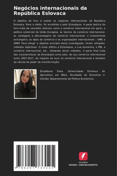 O objetivo do livro é avaliar os negócios internacionais da República Eslovaca. Para o efeito, foi escolhido o país Eslováquia. A parte teórica do livro trata de conceitos teóricos como o comércio internacional em geral, a política comercial da União Europeia, as teorias do comércio internacional, as vantagens e desvantagens do comércio internacional, o investimento estrangeiro, os tipos de comércio e as organizações internacionais - OMC e OPEP. Para atingir o objetivo principal desta investigação, foram utilizados métodos objectivos. O autor definiu a Eslováquia, a sua economia, o PIB, o comércio internacional, etc., utilizando vários métodos. A parte final trata das características da Eslováquia como país, do seu comércio internacional entre 2007-2017, do impacto do euro no comércio internacional e também do cálculo do poder de transformação.