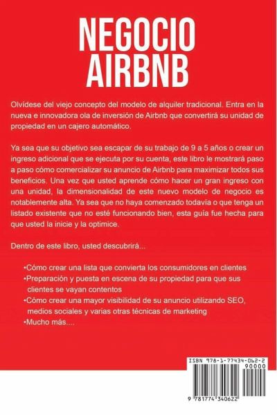 Olvídese del viejo concepto del modelo de alquiler tradicional. Entra en la nueva e innovadora ola de inversión de Airbnb que convertirá su unidad de propiedad en un cajero automático. Ya sea que su objetivo sea escapar de su trabajo de 9 a 5 años o crear un ingreso adicional que se ejecuta por su cuenta, este libro le mostrará paso a paso cómo comercializar su anuncio de Airbnb para maximizar todos sus beneficios. Una vez que usted aprende cómo hacer un gran ingreso con una unidad, la dimensionalidad de este nuevo modelo de negocio es notablemente alta. Ya sea que no haya comenzado todavía o que tenga un listado existente que no esté funcionando bien, esta guía fue hecha para que usted la inicie y la optimice. Dentro de este libro, usted descubrirá.... ¿ Cómo crear una lista que convierta los consumidores en clientes ¿ Preparación y puesta en escena de su propiedad para que sus clientes se vayan contentos ¿ Cómo crear una mayor visibilidad de su anuncio utilizando SEO, medios sociales y varias otras técnicas de marketing ¿ Mucho más.... ¡Para ordenar Airbnb Marketing, haga clic en el botón de comprar y obtenga su copia ahora mismo!