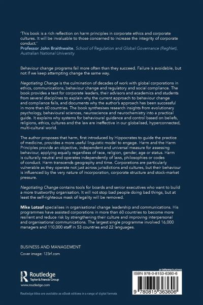 Behaviour change programs fail more often than they succeed. Failure is avoidable, but not if we keep attempting change the same way. Negotiating Change is the culmination of decades of work with global corporations in ethics, communications, behaviour change and regulatory and social compliance. The book provides a text for corporate leaders, their advisors and academics and students from several disciplines to explain why the current approach to behaviour change and compliance fails, and documents why the author's approach has been successful in more than 60 countries. The book synthesises research insights from evolutionary psychology, behavioural sciences, neuroscience and neurochemistry into a practical guide. It explains why systems for behavioural guidance and control based on beliefs, religions, ethics, cultures and the law are ineffective in our globalised, hyper-connected, multi-cultural world. The author proposes that harm, first introduced by Hippocrates to guide the practice of medicine, provides a more useful linguistic model to engage. Harm and the Harm Principles provide an objective, independent and universal measure for assessing behaviour, applying equally regardless of race, religion, gender, age or status. Harm is culturally neutral and operates independently of laws, philosophies or codes of conduct. Harm transcends geography and time. Corporations are particularly vulnerable as they operate not just across jurisdictions and cultures, but their behaviour is influenced by the very nature of incorporation, corporate structure and stock-market pressure. Negotiating Change contains tools for boards and senior executives who want to build a more trustworthy organisation. It will not stop bad people doing bad things, but at least the self-righteous mask of legality will be removed.