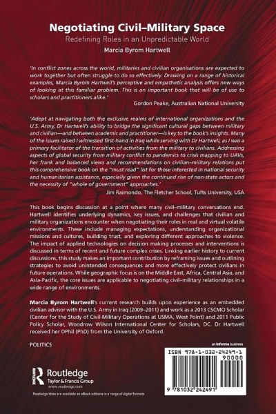 This book begins discussion at a point where many civil-military conversations end. Hartwell identifies underlying dynamics, key issues, and challenges that civilian and military organizations encounter when negotiating their roles in real and virtual volatile environments. These include managing expectations, understanding organizational missions and cultures, building trust, and exploring different approaches to violence. The impact of applied technologies on decision making processes and interventions is discussed in terms of recent and future complex crises. Linking earlier history to current discussions, this study makes an important contribution by reframing issues and outlining strategies to avoid unintended consequences and more effectively protect civilians in future operations. While geographic focus is on the Middle East, Africa, Central Asia, and Asia-Pacific, the core issues are applicable to negotiating civil-military relationships in a wide range of environments.