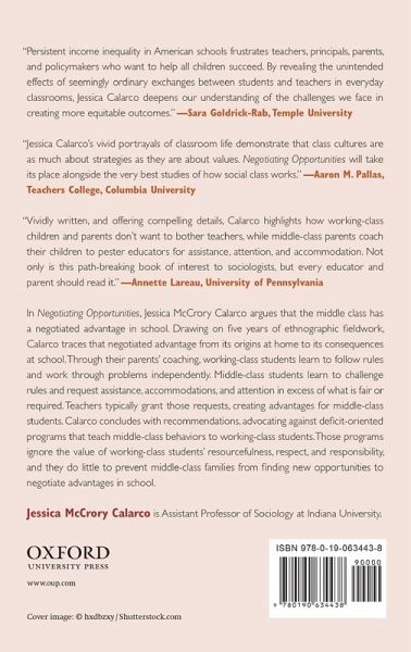 In Negotiating Opportunities, Jessica McCrory Calarco argues that the middle class has a negotiated advantage in school. Drawing on five years of ethnographic fieldwork, Calarco traces that negotiated advantage from its origins at home to its consequences at school. Through their parents' coaching, working-class students learn to follow rules and work through problems independently. Middle-class students learn to challenge rules and request assistance, accommodations, and attention in excess of what is fair or required. Teachers typically grant those requests, creating advantages for middle-class students. Calarco concludes with recommendations, advocating against deficit-oriented programs that teach middle-class behaviors to working-class students. Those programs ignore the value of working-class students' resourcefulness, respect, and responsibility, and they do little to prevent middle-class families from finding new opportunities to negotiate advantages in school.