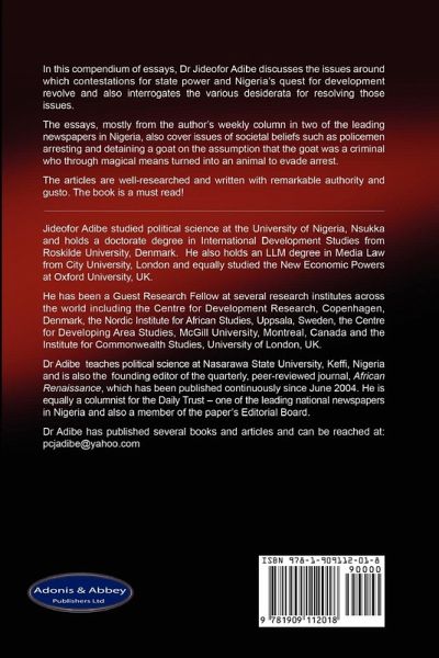 In this compendium of essays, Dr Jideofor Adibe discusses the issues around which contestations for state power and Nigeria's quest for development revolve and also interrogates the various desiderata for resolving those issues. The essays, mostly from the author's weekly column in two of the leading newspapers in Nigeria, also cover issues of 'societal beliefs' such as policemen arresting and detaining a goat on the assumption that the goat was a criminal who through magical means turned into an animal to evade arrest. The articles are well-researched and written with remarkable authority and gusto.