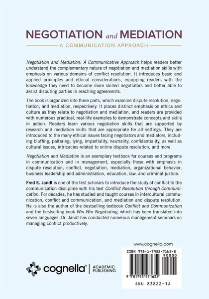 Negotiation and Mediation: A Communicative Approach helps readers better understand the complementary nature of negotiation and mediation skills with emphasis on various domains of conflict resolution. It introduces basic and applied principles and ethical considerations, equipping readers with the knowledge they need to become more skilled negotiators and better able to assist disputing parties in reaching agreements. The book is organized into three parts, which examine dispute resolution, negotiation, and mediation, respectively. It places distinct emphasis on ethics and culture as they relate to negotiation and mediation, and readers are provided with numerous practical, real-life examples to demonstrate concepts and skills in action. Readers learn various negotiation skills that are supported by research and mediation skills that are appropriate for all settings. They are introduced to the many ethical issues facing negotiators and mediators, including bluffing, paltering, lying, impartiality, neutrality, confidentiality, as well as cultural issues, intricacies related to online dispute resolution, and more. Negotiation and Mediation is an exemplary textbook for courses and programs in communication and in management, especially those with emphasis in dispute resolution, conflict, negotiation, mediation, organizational behavior, business leadership and administration, education, law, and criminal justice.