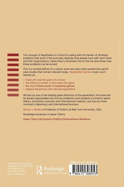 The concept of negotiation is critical to coping with all manner of strategic problems that arise in the everyday dealings that people have with each other and organizations. Game theory illustrates this to the full and shows how these problems can be solved. This is a revised edition of a classic book and uses some wonderfully adroit case studies that remain relevant today. Negotiation Games covers such themes as: · trade offs and the game of chicken · the effects of power in the cease-fire game · the use of threat power in sequential games · fallback bargaining and rational negotiation. Written by one of the leading game theorists of the generation, this book will be greatly appreciated not only by academics and students involved in game theory, economics, business and international relations, but also by those involved in diplomacy and international business.