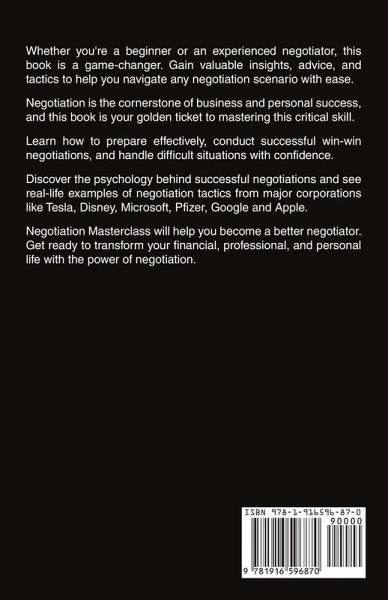 Whether you're a beginner or an experienced negotiator, this book is a game-changer. Gain valuable insights, advice, and tactics to help you navigate any negotiation scenario with ease. Negotiation is the cornerstone of business and personal success, and this book is your golden ticket to mastering this critical skill. Learn how to prepare effectively, conduct successful win-win negotiations, and handle difficult situations with confidence. Discover the psychology behind successful negotiations and see real-life examples of negotiation tactics from major corporations like Tesla, Disney, Microsoft, Pfizer, Google and Apple. Negotiation Masterclass will help you become a better negotiator. Get ready to transform your financial, professional, and personal life with the power of negotiation.