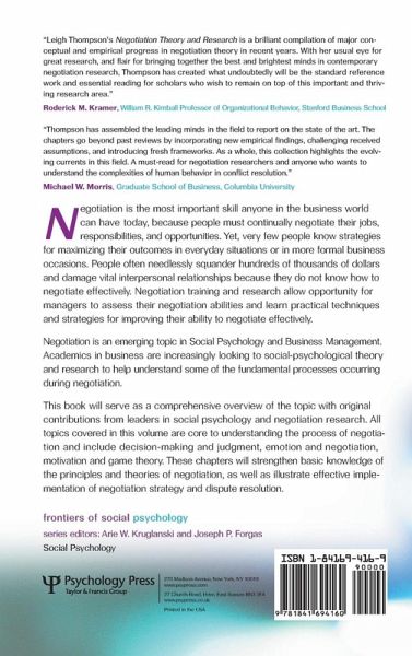 Negotiation is the most important skill anyone in the business world can have today, because people must continually negotiate their jobs, responsibilities, and opportunities. Yet, very few people know strategies for maximizing their outcomes in everyday and in more formal business situations. People often needlessly throw away hundreds of thousands of dollars and sour interpersonal relationships because they do not know how to effectively negotiate. Negotiation training and research allows opportunity for managers to assess their negotiation abilities and learn practical techniques and strategies for improving their ability to negotiate effectively. Negotiation is an emerging topic in social psychology and academics in Business and Management are increasingly looking to social-psychological theory and research to help understand some of the fundamental processes occurring during negotiation. This book will serve as a comprehensive overview of the topic with original contributions from leaders in social psychology and negotiation research. All topics covered in this volume are core to the understanding of the negotiation process and include: decision-making and judgment, emotion and negotiation, motivation and game theory. These chapters will strengthen basic knowledge of the principles and theories of negotiation, as well as illustrate effective implementation of negotiation strategy and dispute resolution.