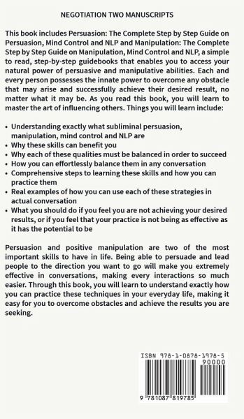 Negotiation: Two Books in One This book includes Persuasion: The Complete Step by Step Guide on Persuasion, Mind Control and NLP and Manipulation: The Complete Step by Step Guide on Manipulation, Mind Control and NLP, a simple to read, step-by-step guidebooks that enables you to access your natural power of persuasive and manipulative abilities. Each and every person possesses the innate power to overcome any obstacle that may arise and successfully achieve their desired result, no matter what it may be. As you read this book, you will learn to master the art of influencing others. Things you will learn include: Understanding exactly what subliminal persuasion, manipulation, mind control and NLP are Why these skills can benefit you Why each of these qualities must be balanced in order to succeed How you can effortlessly balance them in any conversation Comprehensive steps to learning these skills and how you can practice them Real examples of how you can use each of these strategies in actual conversation What you should do if you feel you are not achieving your desired results, or if you feel that your practice is not being as effective as it has the potential to be Persuasion and positive manipulation are two of the most important skills to have in life. Being able to persuade and lead people to the direction you want to go will make you extremely effective in conversations, making every interactions so much easier. Through this book, you will learn to understand exactly how you can practice these techniques in your everyday life, making it easy for you to overcome obstacles and achieve the results you are seeking. Grab your copy today and start negotiating your way to success!