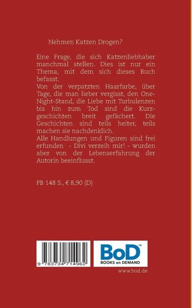 Nehmen Katzen Drogen? - über Katzen, Liebe und andere MissgeschickeEine Frage, die sich Katzenliebhaber nicht nur manchmal stellen. Was hat dieses Tier nur genommen? Kann ich das auch haben?Dies ist nur ein Thema, mit dem sich dieses Buch befasst. Von der Haarfarbe, die nicht ganz den Erwartungen entspricht über einen One-Night-Stand, die Liebe bis hin zum Tod sind die Kurzgeschichten gefächert. Die Geschichten sind teils lustig, teils heiter, manche machen nachdenklich. Die Figuren und Handlungen sind frei erfunden, werden aber von der Lebenserfahrung der Autorin geprägt.
