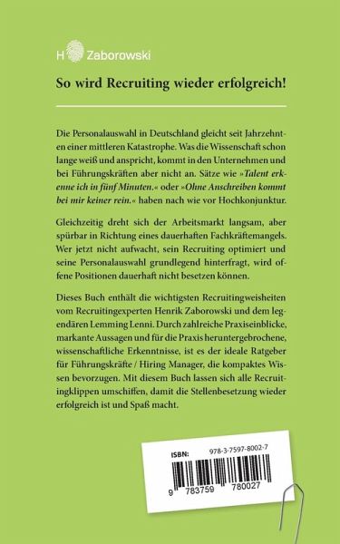 Du bist Führungskraft / Hiring Manager:in und möchtest wissen, wie gutes Recruiting sowie gute Personalauswahl funktionieren und welche Rolle Du dabei spielst? Dann ist dieses Buch genau das Richtige für Dich. Hier findest Du die perfekte Mischung aus über 20 Jahren Praxiserfahrung, kombiniert mit wissenschaftlich fundiertem Eignungsdiagnostikwissen. Gutes Recruiting und vor allem gute Personalauswahl ist kein unerreichbarer Heiliger Gral, sondern erlernbar und auch in Deinem beruflichen Alltag umsetzbar. In diesem Buch findest Du alles, was Du wissen musst. Nicht mehr, aber auch auf keinen Fall weniger. Neben dem wichtigsten Fachwissen findest Du auch immer wieder Praxisbeispiele und kurze, prägnante Statements, die im Kopf bleiben. In jedem Kapitel wirst Du von dem legendären Lemming Lenni begleitet, der, anders als seine Sippe, bei der letzten großen Wanderungen überlebt hat. Weil er sich gut vorbereitet und gelernt hatte, ein Boot zu bedienen. Lass Dich von Lenni inspirieren und mach es wie er: Nimm ein Boot und lerne, wie Du in Zukunft alle Deine offenen Positionen besetzen kannst.