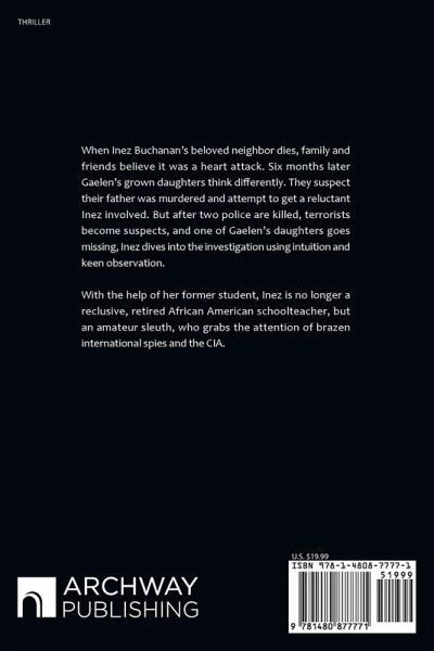 When Inez Buchanan's beloved neighbor dies, family and friends believe it was a heart attack. Six months later Gaelen's grown daughters think differently. They suspect their father was murdered and attempt to get a reluctant Inez involved. But after two police are killed, terrorists become suspects, and one of Gaelen's daughters goes missing, Inez dives into the investigation using intuition and keen observation. With the help of her former student, Inez is no longer a reclusive, retired African American schoolteacher, but an amateur sleuth, who grabs the attention of brazen international spies and the CIA.