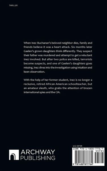 When Inez Buchanan's beloved neighbor dies, family and friends believe it was a heart attack. Six months later Gaelen's grown daughters think differently. They suspect their father was murdered and attempt to get a reluctant Inez involved. But after two police are killed, terrorists become suspects, and one of Gaelen's daughters goes missing, Inez dives into the investigation using intuition and keen observation. With the help of her former student, Inez is no longer a reclusive, retired African American schoolteacher, but an amateur sleuth, who grabs the attention of brazen international spies and the CIA.