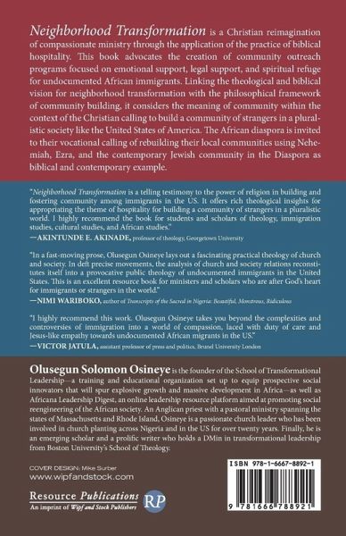 Neighborhood Transformation is a Christian reimagination of compassionate ministry through the application of the practice of biblical hospitality. This book advocates the creation of community outreach programs focused on emotional support, legal support, and spiritual refuge for undocumented African immigrants. Linking the theological and biblical vision for neighborhood transformation with the philosophical framework of community building, it considers the meaning of community within the context of the Christian calling to build a community of strangers in a pluralistic society like the United States of America. The African diaspora is invited to their vocational calling of rebuilding their local communities using Nehemiah, Ezra, and the contemporary Jewish community in the Diaspora as biblical and contemporary example.