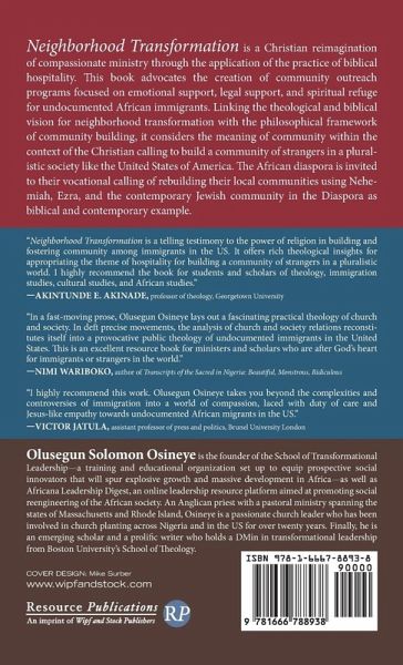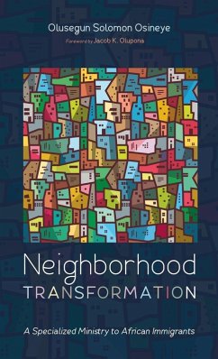 Neighborhood Transformation is a Christian reimagination of compassionate ministry through the application of the practice of biblical hospitality. This book advocates the creation of community outreach programs focused on emotional support, legal support, and spiritual refuge for undocumented African immigrants. Linking the theological and biblical vision for neighborhood transformation with the philosophical framework of community building, it considers the meaning of community within the context of the Christian calling to build a community of strangers in a pluralistic society like the United States of America. The African diaspora is invited to their vocational calling of rebuilding their local communities using Nehemiah, Ezra, and the contemporary Jewish community in the Diaspora as biblical and contemporary example.