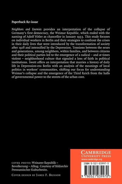 Neighbors and Enemies provides an interpretation of the collapse of Germany's first democracy, the Weimar Republic, which ended with the naming of Adolf Hitler as chancellor in January 1933. This study focuses on individual workers in Berlin and their strategies to confront the crises in their daily lives introduced by the transformation of society after 1918 and intensified during the Depression. Tensions between the sexes and generations, among neighbours, within families, and between citizens and their political parties led to the emergence of a radical - and at times violent - neighbourhood culture that signalled a loss of faith in political institutions. Swett offers an interpretation that marries a history of daily life in Depression-era Berlin with an analysis of the meanings of local politics in workers' communities, shifting our focus for understanding Weimar's collapse from the halls of governmental power to the streets of the urban core.