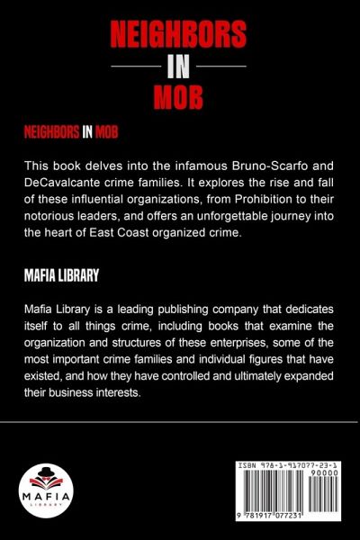 THIS BOOK INCLUDES: 2 ManuscriptsThe BRUNO-SCARFO MAFIA CRIME FAMILY The DECAVALCANTE MAFIA CRIME FAMILY In the first volume, readers will uncover the fascinating legacy of the Bruno-Scarfo family. From its origins in the tumultuous days of Prohibition to its emergence as one of Pennsylvania's most influential and feared criminal organizations, this book is a treasure trove of intrigue. From the cunning leadership of Angelo Bruno to the ruthless reign of Nicodemo' Little Nicky' Scarfo, this book delves into the inner workings of the family, its illicit enterprises, and its bloody conflicts with rival factions and law enforcement. The second volume delves into the shadowy world of the DeCavalcante family, whose roots stretch deep into the underworld of New Jersey. From its humble beginnings in the early 20th century to its heyday as a major player in organized crime, this book traces the rise and fall of the DeCavalcante family, exploring its connections to infamous figures like "Sam the Plumber" DeCavalcante and its tumultuous relationships with other Mafia families across the nation. From their glamorous facades to their brutal realities, these books offer a gripping and authoritative account of the Mafia's enduring influence in Pennsylvania and New Jersey. Whether you're a true crime aficionado or simply fascinated by tales of intrigue and deception, 'Neighbors in Mob'' promises an unforgettable journey into the East Coast's dark heart of organized crime. Grab a copy today!