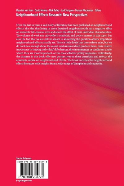 Over the last 25 years a vast body of literature has been published on neighbourhood effects: the idea that living in more deprived neighbourhoods has a negative effect on residents' life chances over and above the effect of their individual characteristics. The volume of work not only reflects academic and policy interest in this topic, but also the fact that we are still no closer to answering the question of how important neighbourhood effects actually are. There is little doubt that these effects exist, but we do not know enough about the causal mechanisms which produce them, their relative importance in shaping individual's life chances, the circumstances or conditions under which they are most important, or the most effective policy responses. Collectively, the chapters in this book offer new perspectives on these questions, and refocus the academic debate on neighbourhood effects. The book enriches the neighbourhood effects literature with insights from a wide range of disciplines and countries.