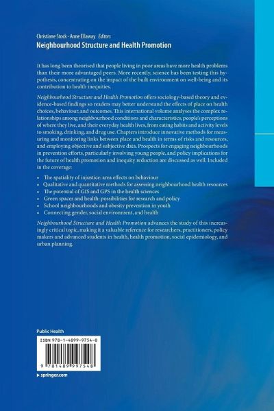 Neighbourhood Structure and Health Promotion offers sociology-based theory and evidence-based findings so readers may better understand the effects of place on health choices, behaviour, and outcomes. This international volume analyzes the complex relationships among neighbourhood conditions and characteristics, people's perceptions of where they live, and their everyday health lives, from eating habits and activity levels to smoking, drinking, and drug use. Chapters introduce innovative methods for measuring and monitoring links between place and health in terms of risks and resources, and employing objective and subjective data. Prospects for engaging neighbourhoods in prevention efforts, particularly involving young people, and policy implications for the future of health promotion and inequity reduction are discussed as well. Included in the coverage: