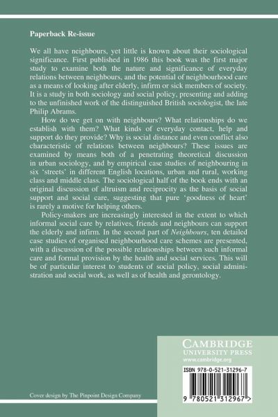 Neighbours is a study in both sociology and social policy. First published in 1986, this book, which presents and extends the work of the distinguished sociologist Philip Abrams (d. 1981), was the first major study of neighbours in Britain since the 1960s. It made an important contribution to urban sociological theory and to understanding actual patterns of neighbouring in widely different parts of England. Neighbourhood care - help for the elderly, infirm and sick by those who live near them - is potentially a very important kind of informal social care, and the second part of the book examines by means of ten detailed case studies the potential for neighbourhood care in contemporary Britain. A central philosophical chapter suggests that pure 'goodness of heart' is rarely a motive for helping others.