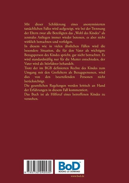 Mit dieser Schilderung eines anonymisierten tatsächlichen Falles wird aufgezeigt, wie bei der Trennung der Eltern zwar alle Beteiligten das "Wohl des Kindes" als zentrales Anliegen immer wieder betonen, es aber nicht wirklich betrachten und verfolgen.In diesem wie in vielen ähnlichen Fällen wird die besondere Situation, die für den Vater als wichtigste Bezugsperson des Kindes spricht, gar nicht betrachtet. Es wird standardmäßig nur für die Mutter entschieden, der Vater wird als Störfaktor behandelt.Trotz der im BGB definierten Rechte des Kindes zum Umgang mit den Großeltern als Bezugspersonen, wird dies von den beurteilenden Personen nicht berücksichtigt.Die gesetzlichen Regelungen werden kritisch an Hand der Erfahrungen in diesem Fall kommentiert.Das Buch ist als Hilferuf eines betroffenen Kindes zu verstehen.