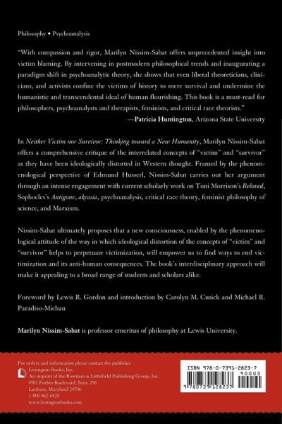 In Neither Victim nor Survivor: Thinking toward a New Humanity, Marilyn Nissim-Sabat offers a comprehensive critique of the interrelated concepts of "victim" and "survivor" as they have been ideologically distorted in Western thought. Nissim-Sabat proposes that a phenomenological attitude empowers us to overcome the anti-human consequences of both victimization of individuals and peoples and the ideological distortions of concepts that help to perpetuate that victimization.