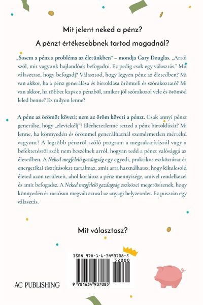 Mit jelent neked a pénz? A pénzt értékesebbnek tartod magadnál? ¿Sosem a pénz a probléma az életünkben" - mondja Gary Douglas. ¿Arról szól, mit vagyunk hajlandóak befogadni. Ez pedig csak egy választás." Mit választasz, hogy befogadj? Választod, hogy legyen pénz az életedben? Mi van akkor, ha a pénz generálása és birtoklása örömteli és szórakoztató? Mi van akkor, ha többet kapsz a pénzb¿l, amikor jól szórakozol vele és örömöd leled benne? Ez milyen lenne? A pénz az örömöt követi; nem az öröm követi a pénzt. Csak annyi pénzt generálsz, hogy ¿elevickélj"? Elérhetetlenné tetted a pénz birtoklását? Mi lenne, ha könnyedén és örömmel generálhatnál szemérmetlen mérték¿ vagyont? A legtöbb pénzr¿l szóló program a megtakarításról vagy a befektetésr¿l szól; nem beszélnek arról, hogyan tedd a pénzt valósággá az életedben. A Neked megfelel¿ gazdagság egy egyedi, praktikus eszköztárat és energetikai tisztításokat tartalmaz, amit arra használhatsz, hogy kikulcsold életed azon területeit, ahol korlátoz a pénz mennyisége, amivel rendelkezel és amit befogadsz. A Neked megfelel¿ gazdagság eszközei meger¿sítenek, hogy könnyedén és tartósan megváltoztasd az anyagi helyzetedet. Ez pusztán egy választás. Mit választasz?