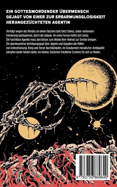 Ein gottesmordender Übermensch gejagt von einer zur Erbarmungslosigkeit herangezüchteten Agentin Verfolgt wegen des Mordes an einem falschen Gott hetzt Darius, seiner verlorenen Erinnerung nachspürend, durch die Galaxie. An seine Fersen heftet sich Senta. Die furchtlose Agentin muss den Ketzer zum Wohle ihrer Heimat zur Strecke bringen. Die abenteuerliche Verfolgungsjagd lässt Jägerin und Gejagten die Höllen von Unterdrückung, Krieg und Terror durchkämpfen. Im Graubereich moralischer Ambiguität kämpfen beide Helden dafür, ein kleines Stückchen friedlicher Existenz für sich zu finden.