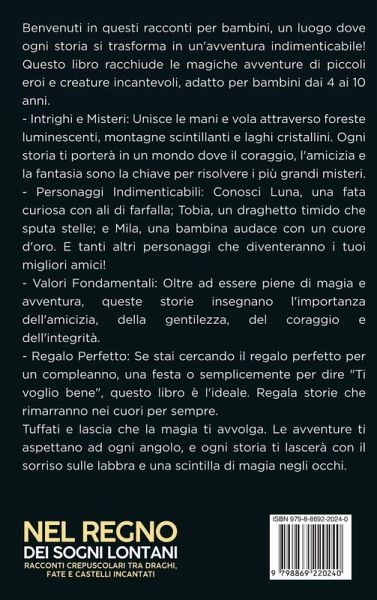 Benvenuti in questi racconti per bambini, un luogo dove ogni storia si trasforma in un'avventura indimenticabile! Questo libro racchiude le magiche avventure di piccoli eroi e creature incantevoli, adatto per bambini dai 4 ai 10 anni. - Intrighi e Misteri: Unisce le mani e vola attraverso foreste luminescenti, montagne scintillanti e laghi cristallini. Ogni storia ti porterà in un mondo dove il coraggio, l'amicizia e la fantasia sono la chiave per risolvere i più grandi misteri. - Personaggi Indimenticabili: Conosci Luna, una fata curiosa con ali di farfalla; Tobia, un draghetto timido che sputa stelle; e Mila, una bambina audace con un cuore d'oro. E tanti altri personaggi che diventeranno i tuoi migliori amici! - Valori Fondamentali: Oltre ad essere piene di magia e avventura, queste storie insegnano l'importanza dell'amicizia, della gentilezza, del coraggio e dell'integrità. - Regalo Perfetto: Se stai cercando il regalo perfetto per un compleanno, una festa o semplicemente per dire "Ti voglio bene", questo libro è l'ideale. Regala storie che rimarranno nei cuori per sempre. Tuffati e lascia che la magia ti avvolga. Le avventure ti aspettano ad ogni angolo, e ogni storia ti lascerà con il sorriso sulle labbra e una scintilla di magia negli occhi.