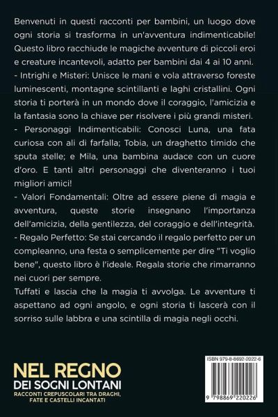 Benvenuti in questi racconti per bambini, un luogo dove ogni storia si trasforma in un'avventura indimenticabile! Questo libro racchiude le magiche avventure di piccoli eroi e creature incantevoli, adatto per bambini dai 4 ai 10 anni. - Intrighi e Misteri: Unisce le mani e vola attraverso foreste luminescenti, montagne scintillanti e laghi cristallini. Ogni storia ti porterà in un mondo dove il coraggio, l'amicizia e la fantasia sono la chiave per risolvere i più grandi misteri. - Personaggi Indimenticabili: Conosci Luna, una fata curiosa con ali di farfalla; Tobia, un draghetto timido che sputa stelle; e Mila, una bambina audace con un cuore d'oro. E tanti altri personaggi che diventeranno i tuoi migliori amici! - Valori Fondamentali: Oltre ad essere piene di magia e avventura, queste storie insegnano l'importanza dell'amicizia, della gentilezza, del coraggio e dell'integrità. - Regalo Perfetto: Se stai cercando il regalo perfetto per un compleanno, una festa o semplicemente per dire "Ti voglio bene", questo libro è l'ideale. Regala storie che rimarranno nei cuori per sempre. Tuffati e lascia che la magia ti avvolga. Le avventure ti aspettano ad ogni angolo, e ogni storia ti lascerà con il sorriso sulle labbra e una scintilla di magia negli occhi.