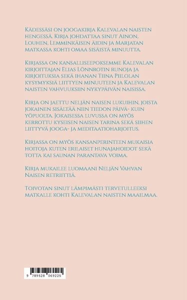Kädessäsi on joogakirja Kalevalan naisten hengessä. Kirja johdattaa sinut Ainon, Louhen, Lemminkäisen äidin ja Marjatan matkassa kohti omaa sisäistä minuutta. Kirjassa on kansalliseepoksemme Kalevalan kirjoittajan Elias Lönnrotin runoja ja kirjoituksia sekä ihanan Tiina Piilolan kysymyksiä liittyen minuuteen ja Kalevalan naisten vahvuuksiin nykypäivän naisissa. Kirja on jaettu neljän naisen lukuihin, joista jokainen sisältää niin tiedon päivä- kuin yöpuolta. Jokaisessa luvussa on myös kerrottu kyseisen naisen tarina sekä siihen liittyvä jooga- ja meditaatioharjoitus. Kirjassa on myös kansanperinteen mukaisia hoitoja kuten erilaiset hunajahoidot sekä totta kai saunan parantava voima. Kirja mukailee luomaani Neljän Vahvan Naisen retriittiä. Toivotan sinut lämpimästi tervetulleeksi matkalle kohti Kalevalan naisten maailmaa.